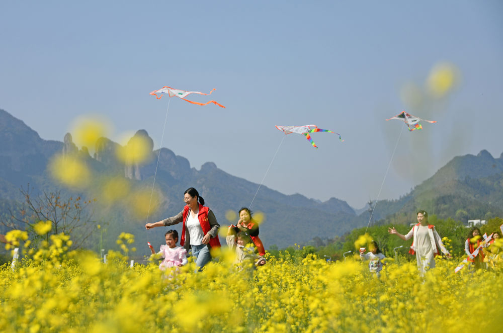 ↑ 4月7日,浙江省台州市仙居县白塔镇第一幼儿园老师带领小朋友在油菜花海间放飞风筝。新华社发(王华斌摄)