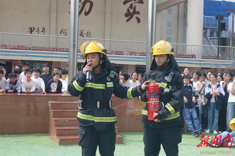 4月11日上午,新田一中全校师生开展消防应急疏散演练,努力掌握火灾逃生技巧和自救方法,学习如何检查消防安全隐患、如何正确使用灭火器等,增强火灾防范意识与应急处置能力。(湖南日报·新湖南客户端通讯员 徐声军 蔡培 摄)