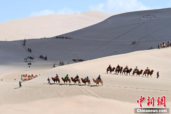 游客在敦煌鸣沙山月牙泉景区骑骆驼。