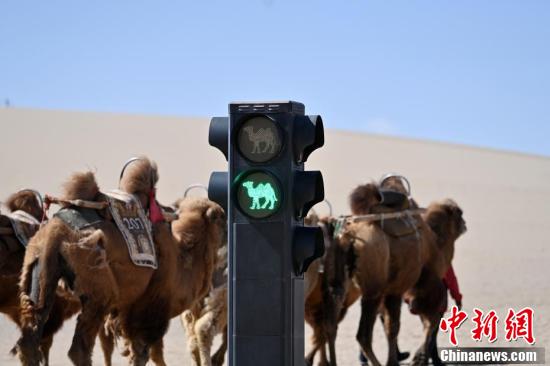 敦煌鸣沙山月牙泉景区内的“骆驼红绿灯”。