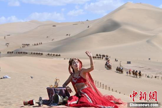 游客身穿“敦煌服饰”在鸣沙山月牙泉景区旅拍。