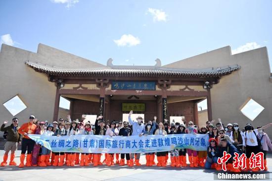 嘉宾在敦煌鸣沙山月牙泉景区合影留念。