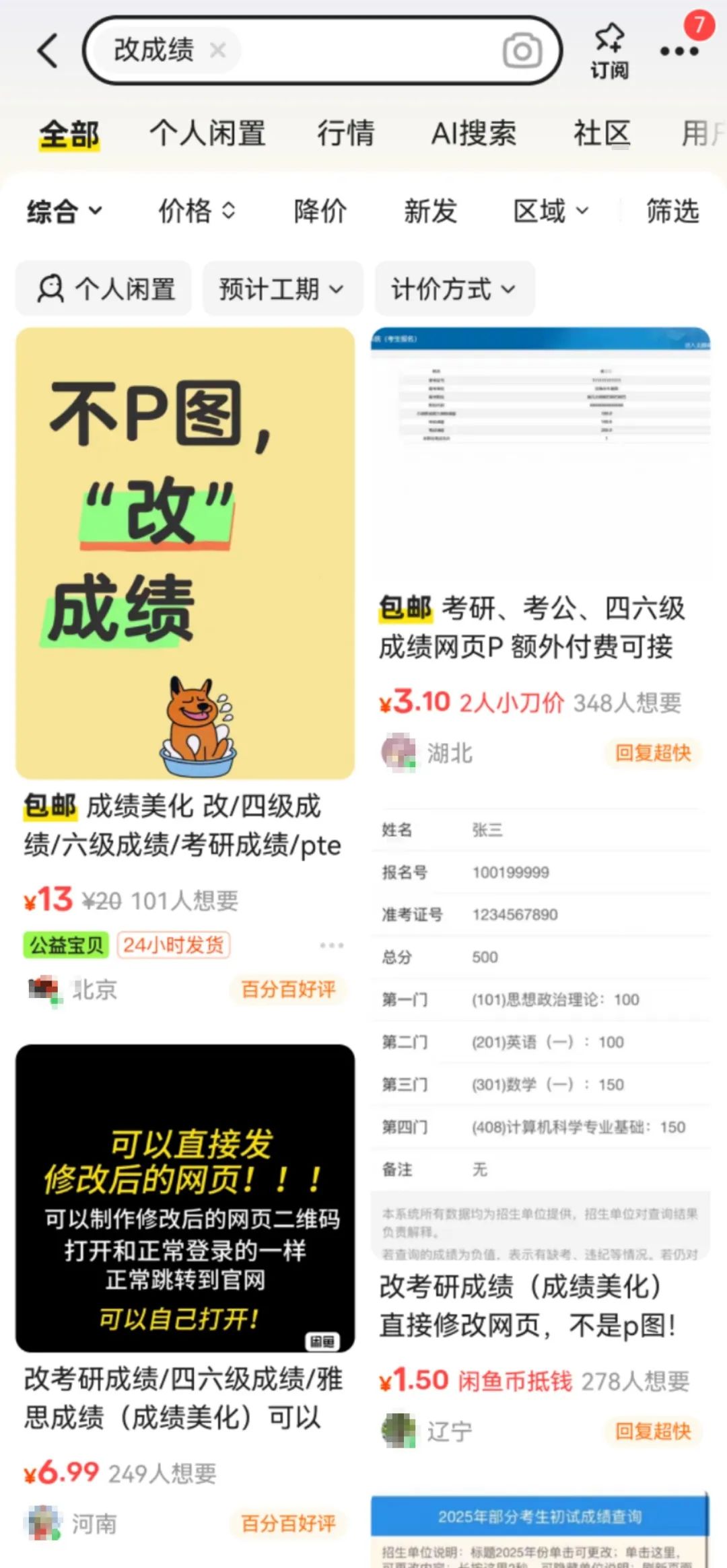 据封面新闻今年2月的报道,在网络平台,“考研改成绩”已发展成一门生意,除了P图修改这一方式,还“进化”出了修改网页的方式,价格在5至69元不等。