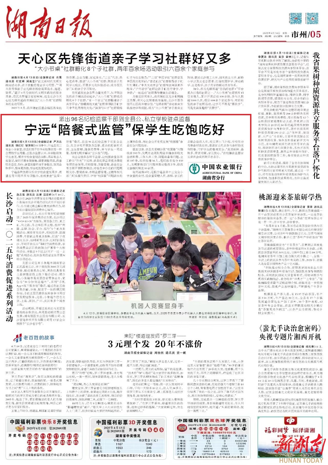 湖南日报4月13日讯(全媒体记者 严万达 通讯员 胡红灯 邹方明)11日中午,宁远县第三完全小学食堂,该县纪检干部李卓桓像往常一样自费陪学生用餐。自驻点监督以来,李卓桓收集学生意见,要求学校食堂规范油料、菜品等出入库登记,做好消毒杀菌措施,循季调整菜谱,改善服务态度。如今,食堂就餐环境干净整洁,饭菜品种多样,服务更热情,学生吃饱更能吃好。