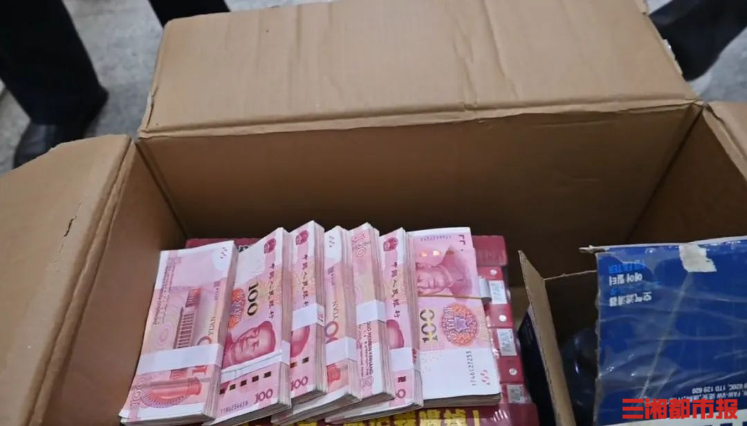 7日17时,在大瑶派出所副所长陈辉和民警彭熙阳的见证下,李子强打开纸箱进行检查。纸箱内除了牛奶、食用油、纸巾等物品,还有一个被胶带裹得严严实实的空调滤芯包装盒,打开盒子,里面藏着几沓红彤彤的百元大钞,清点后发现有7.9万元。