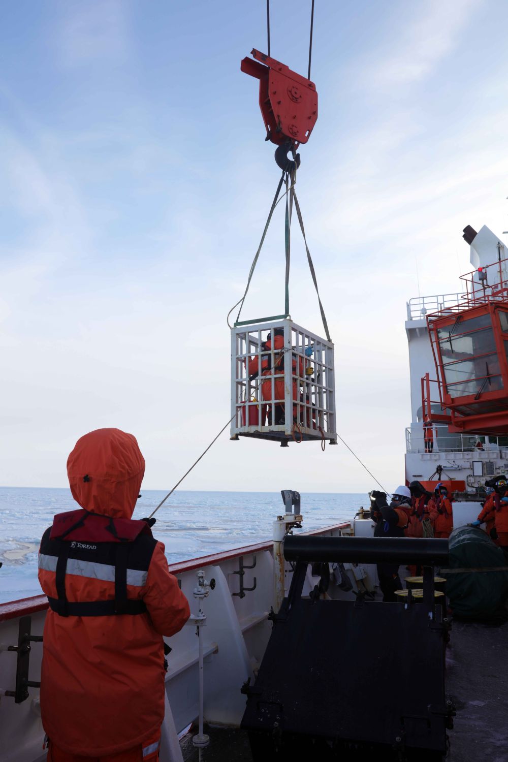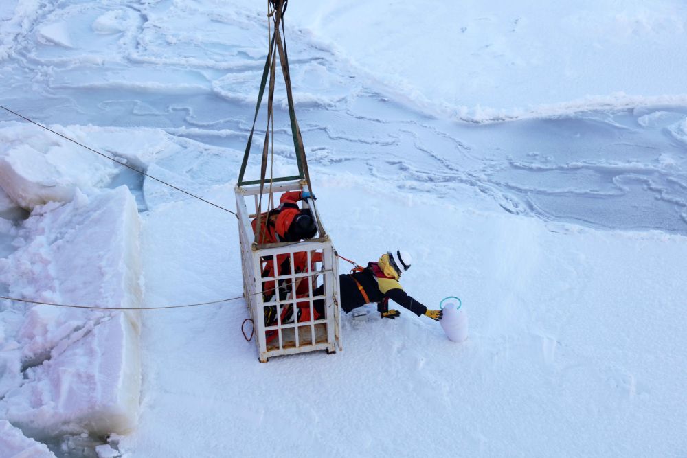 ↑ 3月29日,科考队员乘坐吊笼,准备布放浪-冰浮标和海冰漂流浮标。