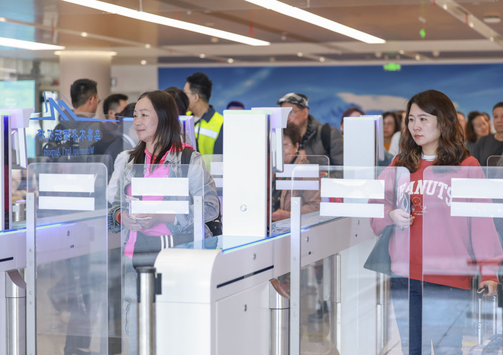 ↑ 4月17日,旅客在乌鲁木齐天山国际机场北区航站楼登机口办理登机手续。