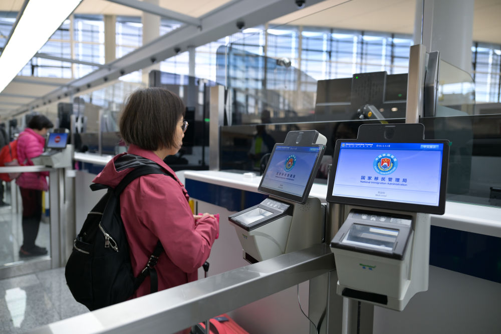 ↑ 4月17日,旅客在乌鲁木齐天山国际机场北区航站楼出入境边防检查出境大厅办理手续。
