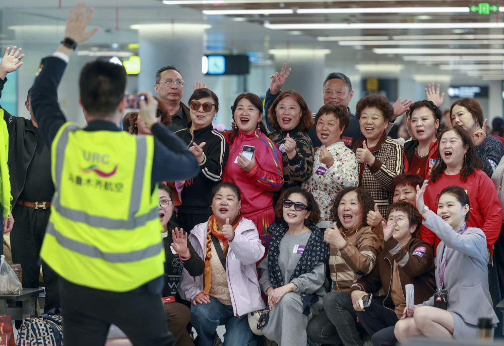 ↑ 4月17日,旅客在乌鲁木齐天山国际机场北区航站楼候机厅与乌鲁木齐航空公司工作人员合影留念。