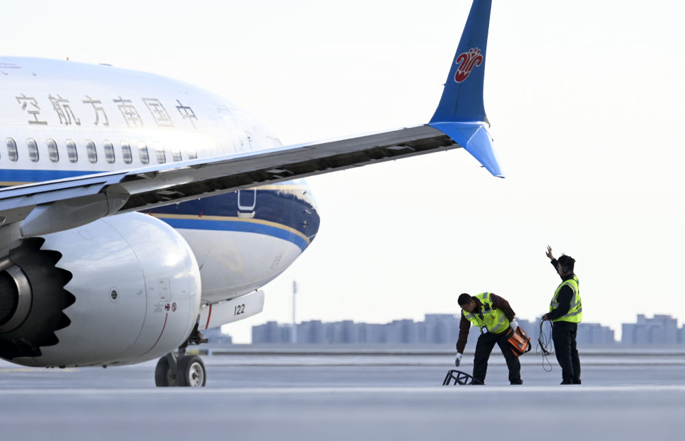 ↑ 4月17日,南航机务工程师在乌鲁木齐天山国际机场停机坪为航班起飞做最后的检查工作。