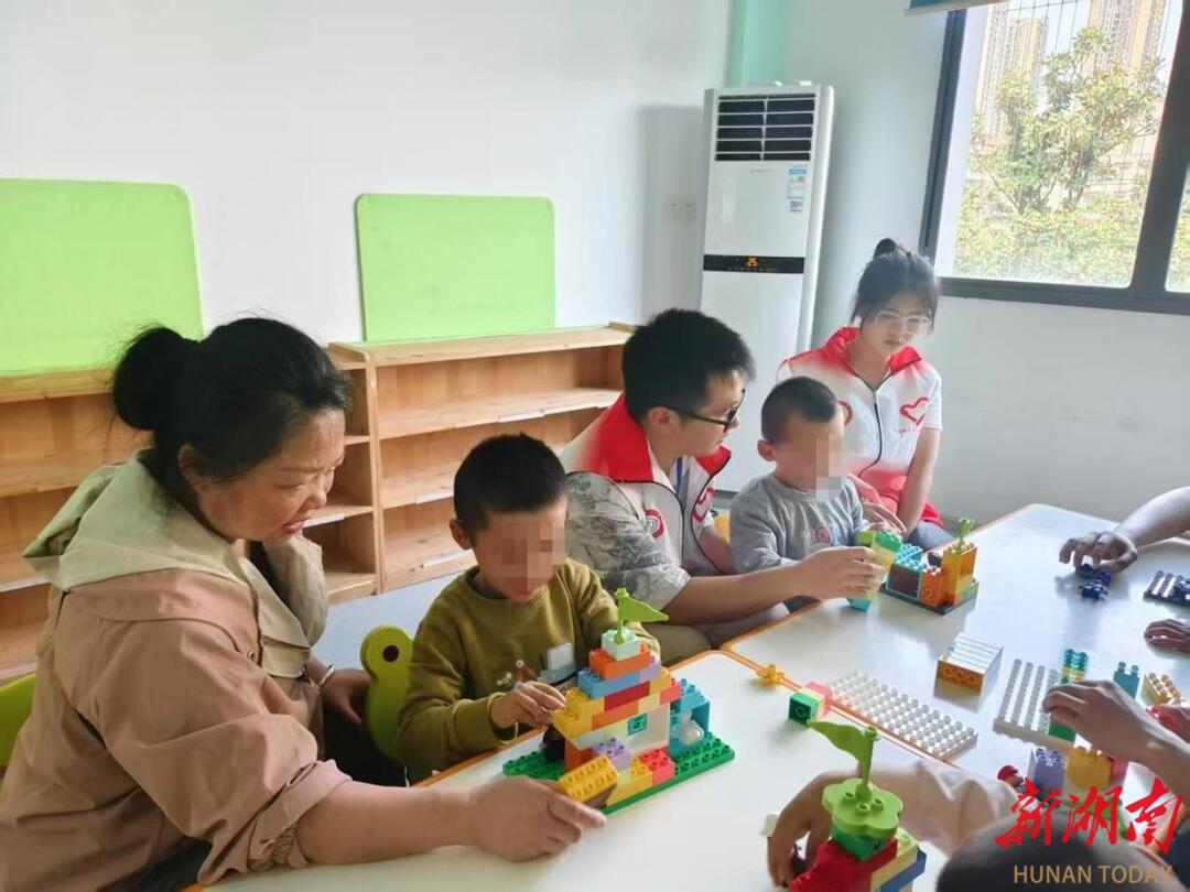 走进益阳市星愿儿童能力发展中心,康复治疗师们在各自的功能区域忙碌着,耐心地与孩子们交流、示范,了解他们的康复进展和心理状态,提供专业的康复指导,给予他们温暖的鼓励和支持。大通湖区残联的工作人员和城市学院的大学生志愿者代替家长与孤独症儿童一起参与课程,陪同孩子做小游戏,在星愿老师的指导下分别与孤独症儿童开展手工折纸和乐高搭建,穿玩偶服与孤独症儿童在各个环节进行互动。