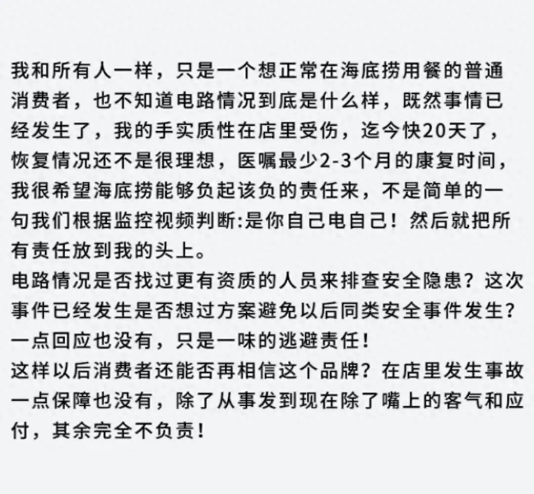 此前,据扬子晚报报道,江苏苏州陈女士发帖称于3月30日在海底捞就餐时,触碰到蘸料台的金属边缘导致左手触电受伤,之后持续出现僵硬、乏力、麻木症状,就医治疗大半个月后仍需再进行两到三个月的康复治疗。身为游泳教练的陈女士希望海底捞承担3000多元医药费和后续误工费,但海底捞门店负责人称陈女士拿调料前扎了头发,所穿衣服也是容易引起静电的材质,因此不排除是陈女士自己的责任。