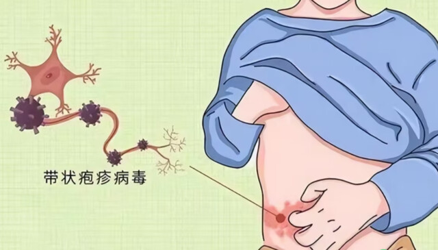结合病史和症状,医生告诉何先生,他患上了带状疱疹。这是一种由水痘—带状疱疹病毒引起的疾病,病毒通常在人体初次感染水痘后,便潜伏在神经节内,当人体免疫力下降时,病毒被再次激活,引发带状疱疹。