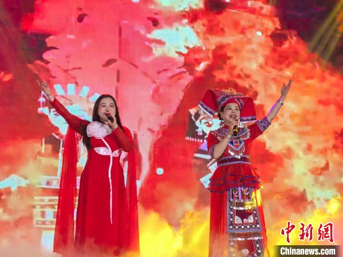 图为国家一级演员、广西壮族民歌歌手黄春艳(右)与越南民歌手阮庆日玄联袂唱响中国民歌《大地飞歌》。 林涌泉 摄