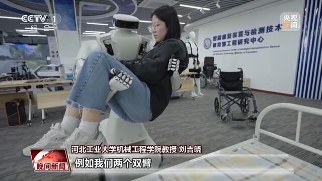 在河北工业大学,这款养老机器人,经过多年研发,已经可以在工程师的协作下,伸出超长双臂,稳稳地将人从床上抱起,并移位到轮椅上。