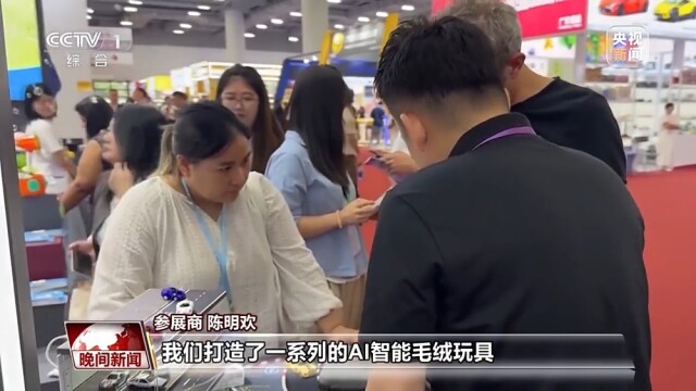 参展商 陈明欢:结合潮玩的趋势,我们打造了一系列的AI智能毛绒玩具,在广交会期间得到了非常好的反响,我们一天下来连坐凳子的时间都没有。