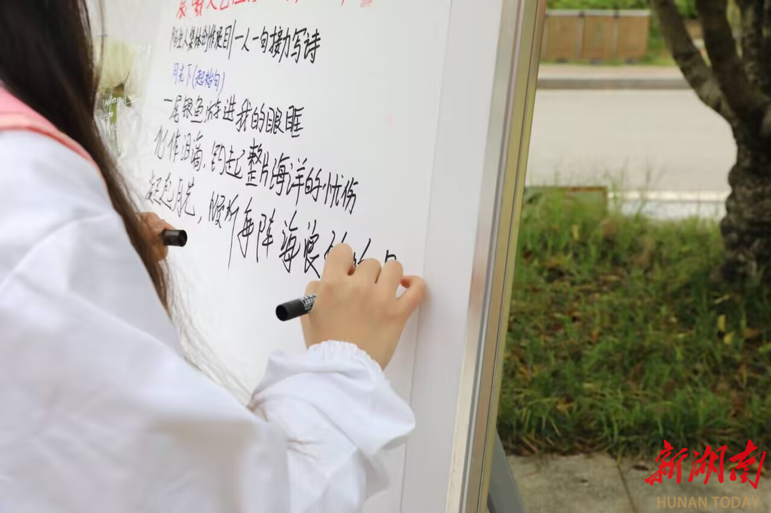 “月光下,一尾银鱼游进我的眼眶”“化作泪滴,钓起整片海洋的忧伤”“泛起月光,倾听每阵海浪的回响”,四月上旬,晨曦文学艺术社策划的“拾年诗约,以诗换花”诗歌接力创作活动中,同学们纷纷参与。“我是慕名来参加活动的,‘春载满园繁花盛,尘光洒向万物生。何妨涩花迟盛开,婉如佳人半遮面。’这是我拟写的一首古体诗。”材料2403班罗铭善同学说。