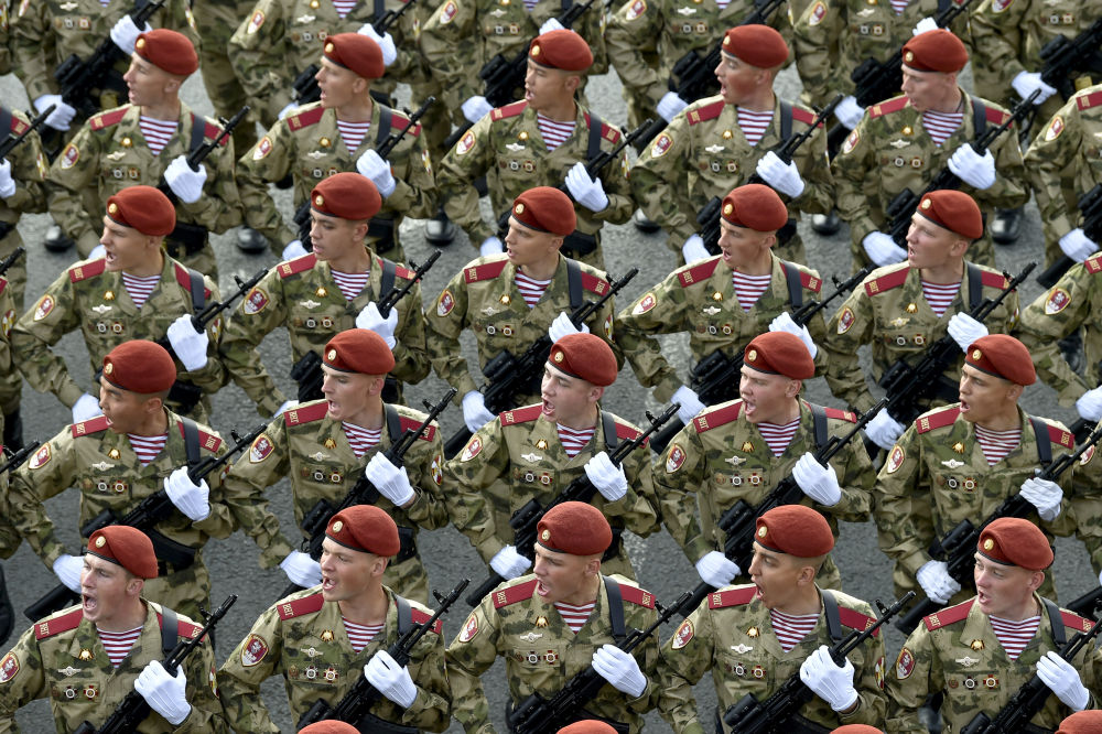 ↑5月7日,在俄罗斯首都莫斯科,士兵列队准备参加纪念苏联伟大卫国战争胜利80周年阅兵式彩排。