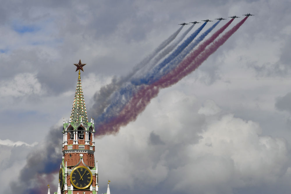 ↑5月7日,在俄罗斯首都莫斯科,战机编队参加纪念苏联伟大卫国战争胜利80周年阅兵式彩排。