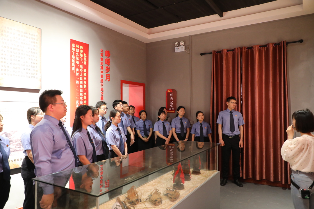 活动第一站,青年干警职工走进中国工农红军第七军指挥所旧址及绥宁党史陈列馆。在讲解员的带领下,大家通过一张张珍贵的历史图片、一件件厚重的革命文物、一段段感人的英雄事迹,重温红七军在绥宁浴血奋战的峥嵘岁月,深刻感悟革命先辈坚定信念、不畏艰险、敢于胜利的精神品格。在绥宁党史陈列馆前,全体青年党员干警职工面向党旗庄严宣誓,重温入党誓词。