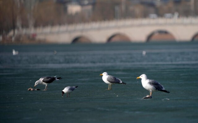 3月7日,候鸟在银川市北塔湖栖息、觅食。 新华社记者 王鹏 摄