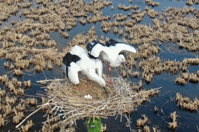 4月24日,在位于黑龙江省肇东市的千鹤岛旅游风景区,一对东方白鹳在人工鸟巢中筑巢繁衍(无人机照片)。新华社记者 谢剑飞 摄