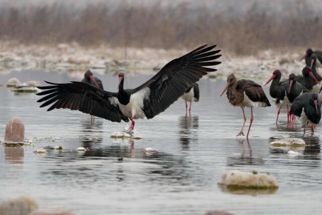 2月11日,一群黑鹳在河北省井陉县境内的绵蔓河内觅食。新华社记者 杨世尧 摄
