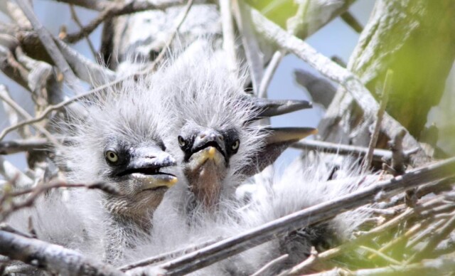 4月23日,北京市密云水库鸟岛上两只等待哺育的小苍鹭。新华社记者 李欣 摄