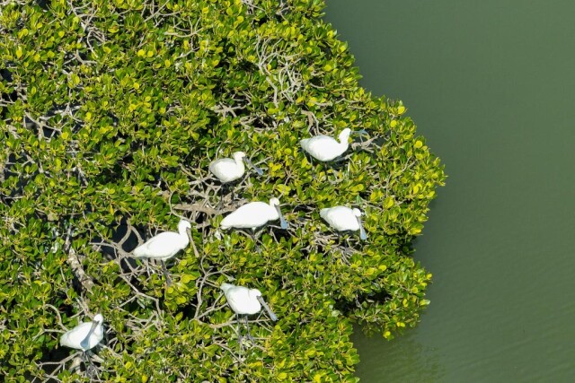 1月18日在海南儋州新盈红树林国家湿地公园拍摄的黑脸琵鹭(无人机照片)。 新华社记者 张丽芸 摄