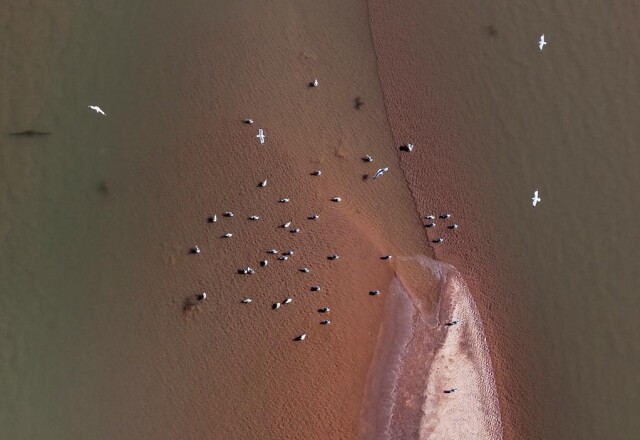 3月30日,在松花江哈尔滨段一处水域,红嘴鸥飞过正在融化的冰排(无人机照片)。 新华社发(张树 摄)