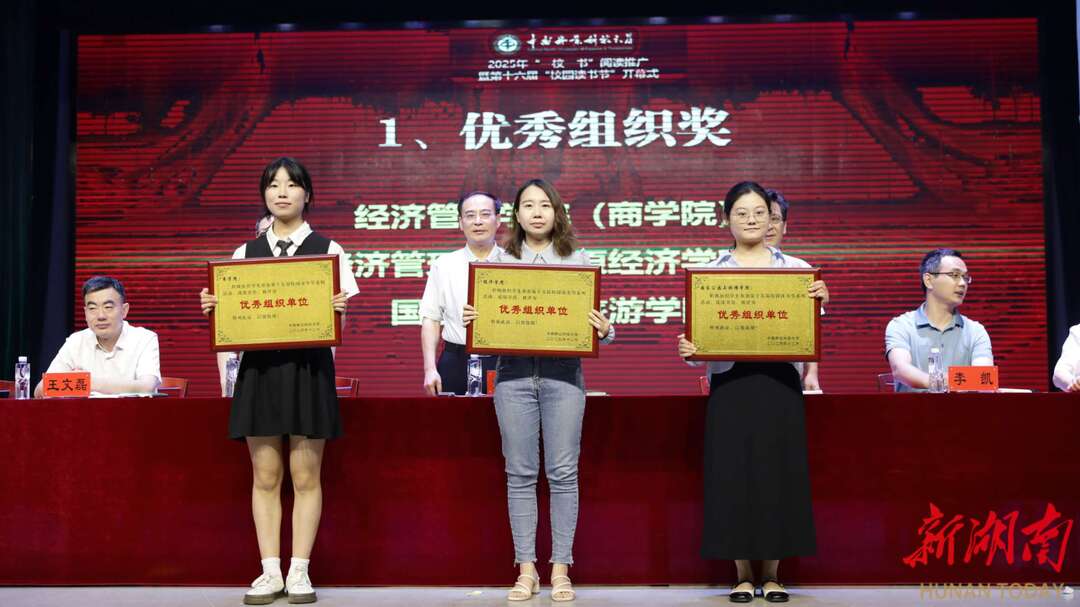 活动现场颁发了“优秀组织奖”“书香班级奖”“优秀读书报告奖”“优秀阅读推广人”等八类奖项。经济学院2023级金融1班获湖南省教育厅“书香班级”殊荣。当天,在学校图书馆东馆前坪,还举行了数字资源游园展。