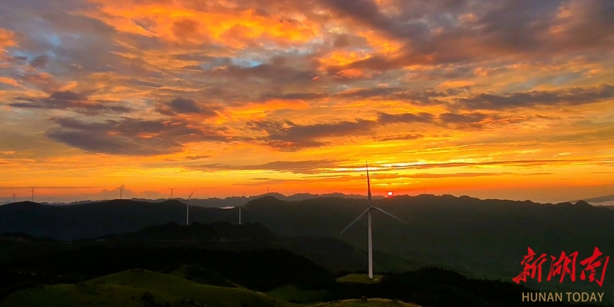湖南日报·新湖南客户端5月13日讯(通讯员 唐芳艳 刘哲 记者 郑丹枚)5月11日傍晚,随着夕阳缓缓沉入地平线,邵阳市绥宁县宝鼎山惊现绝美晚霞,宛如一幅绚烂神秘的画卷,蔚为壮丽。在延时摄影镜头下,每一帧都定格了晚霞变幻莫测的美。金色的阳光与五彩斑斓的云雾交织在一起,仿佛是大自然的调色盘倾泻而下,将宝鼎山装点得分外妖娆。在霞光的映衬下,山间的树木、远处的山峦与转动的风车,如同披上了一层神秘而浪漫的面纱,让人沉醉在这如诗如画的初夏晚霞之中。