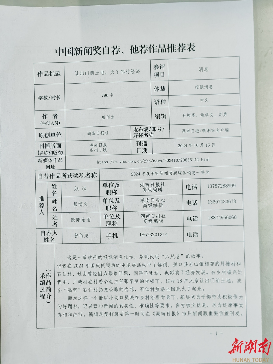 根据《中国新闻奖评选办法》和《第35届中国新闻奖参评作品报送通知》,湖南日报刊发的典型报道《洞口县月塘村村委会老主任张学庭“先干一步”,带动另外十八户人家——让出门前土地,火了邻村经济》拟通过他荐参评第35届中国新闻奖。现将作品相关信息公示,公示期为5个工作日(2025年5月14日至19日)。在此期间,如有异议,可通过电话或电子邮件等方式反映。