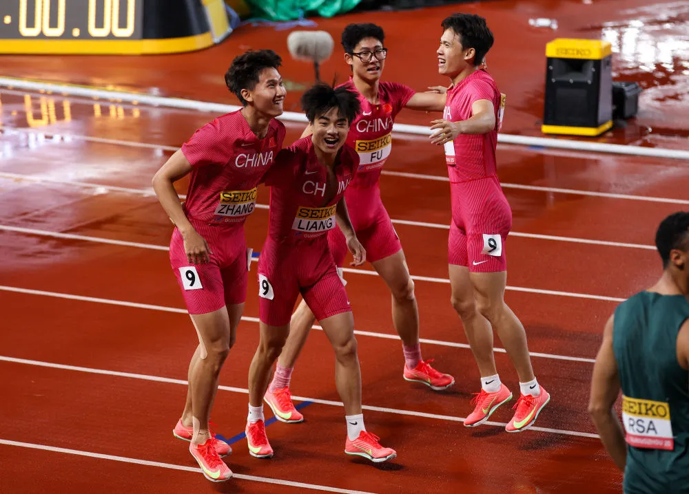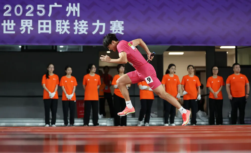 ↑5月10日,中国队第一棒梁宝棠(前)在比赛中出发。新华社记者 李明 摄