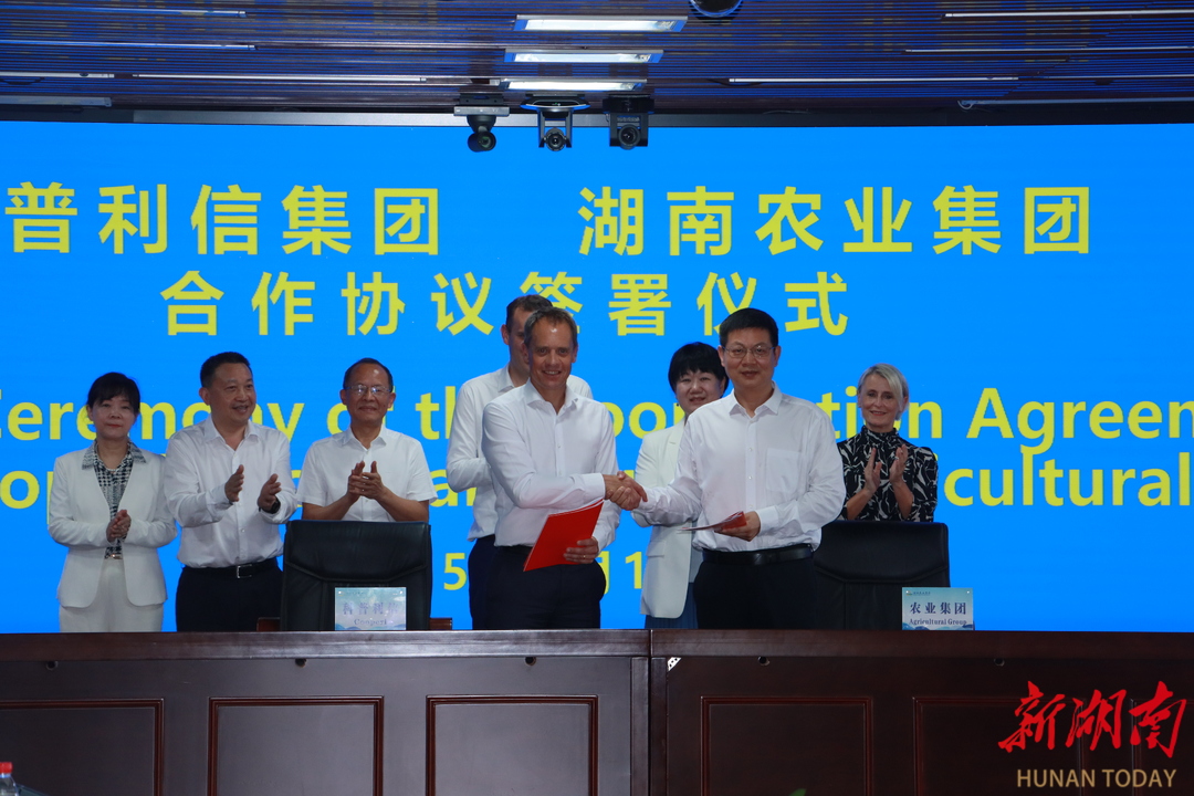 5月16日,法国科普利信集团首席执行官高默一行到访湖南农业集团,双方签署生猪育种股东合作协议和肉品深加工战略合作协议。省商务厅党组成员、副厅长郭宁,省农业农村厅一级巡视员兰定国,省农业农村厅畜牧兽医处处长武深树,省国资委对外合作处一级调研员罗江帆,湖南农业集团党委书记、董事长龚小波,党委副书记、副董事长、总经理杨正华,株洲市渌口区委书记李晓彤参加会议。