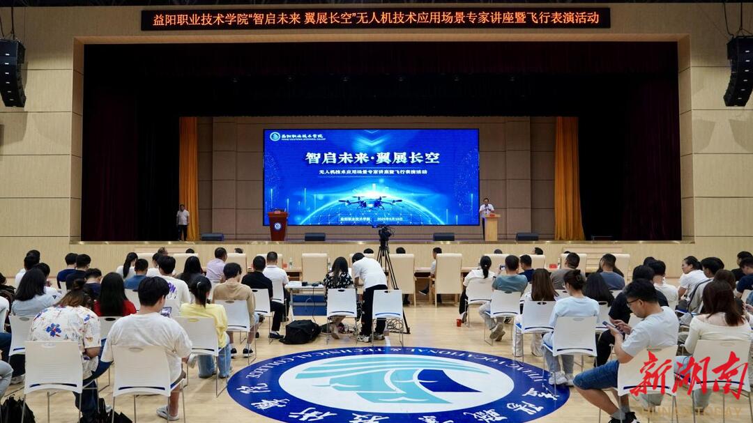 湖南日报•新湖南客户端5月16日讯(通讯员 许可欣 夏建兵) “快看!无人机画出了彩虹!”5月15日下午,益阳职业技术学院格外热闹,学校特邀湖南省无人机协会副会长、湖南智航飞购科技有限公司董事长戴旺作专题讲座,益阳市科技体育模型运动协会带来的无人机飞行表演,引得现场师生阵阵欢呼。近3000名师生参加活动,高新产业学院校区通过直播方式同步观看。