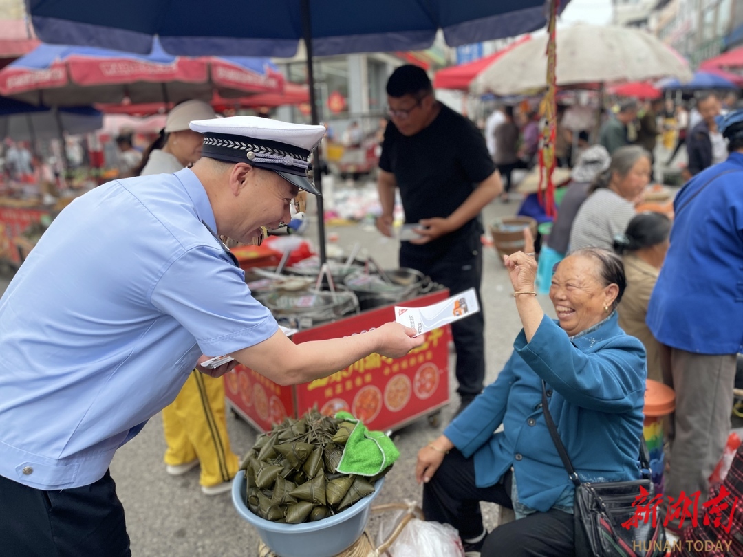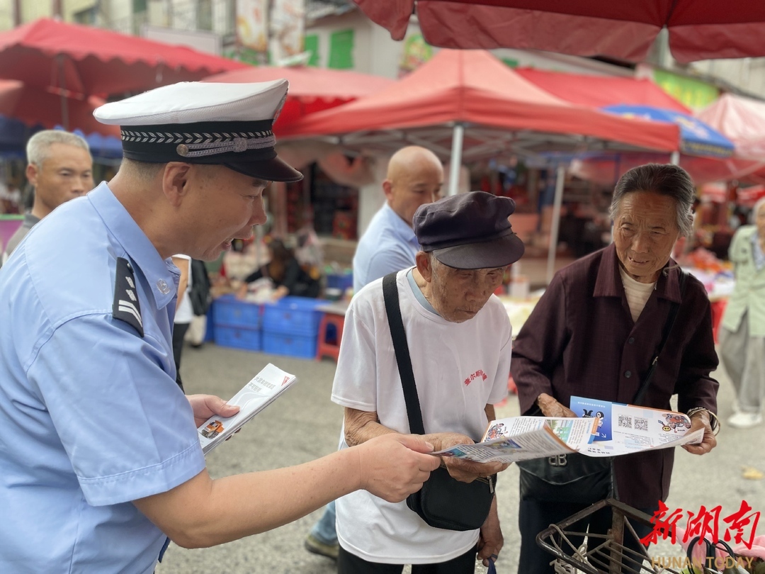 新湖南客户端5月16日讯(通讯员 张红军 黄宁 田海燕)5月14日,湘西土家族苗族自治州凤凰县公安局交管大队走进阿拉营镇赶集现场,开展交通安全宣传活动,为村民们送上实用的“安全锦囊”。