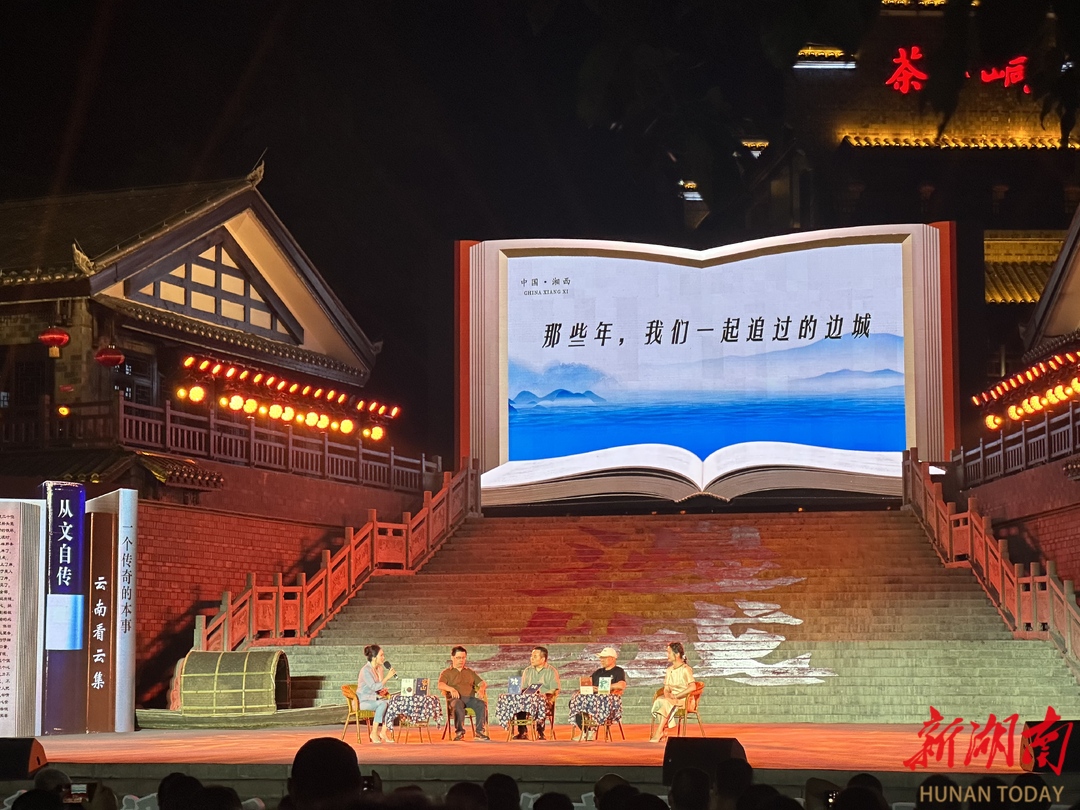 夜幕低垂,全民阅读主题晚会在从文广场以“追梦”“追爱”“追光”三重奏拉开帷幕,中国作协主席团委员王跃文、文化学者张建永等四位名家,在茶峒实景舞台上与3000余名观众共话“从文阅读”。“每天关机两小时,让纸质书抚平数字时代的焦虑。”张建永倡议大家在茶峒山水中,找到对抗浮躁的力量。