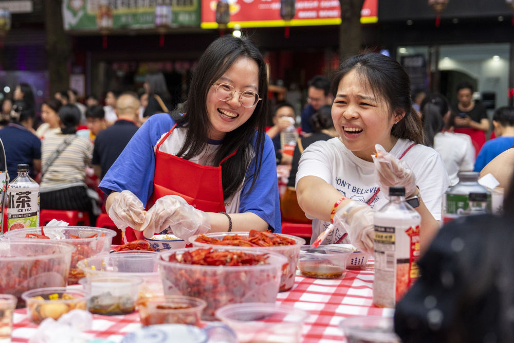 ↑ 5月16日,在南县沿湖路,游客在品尝小龙虾。