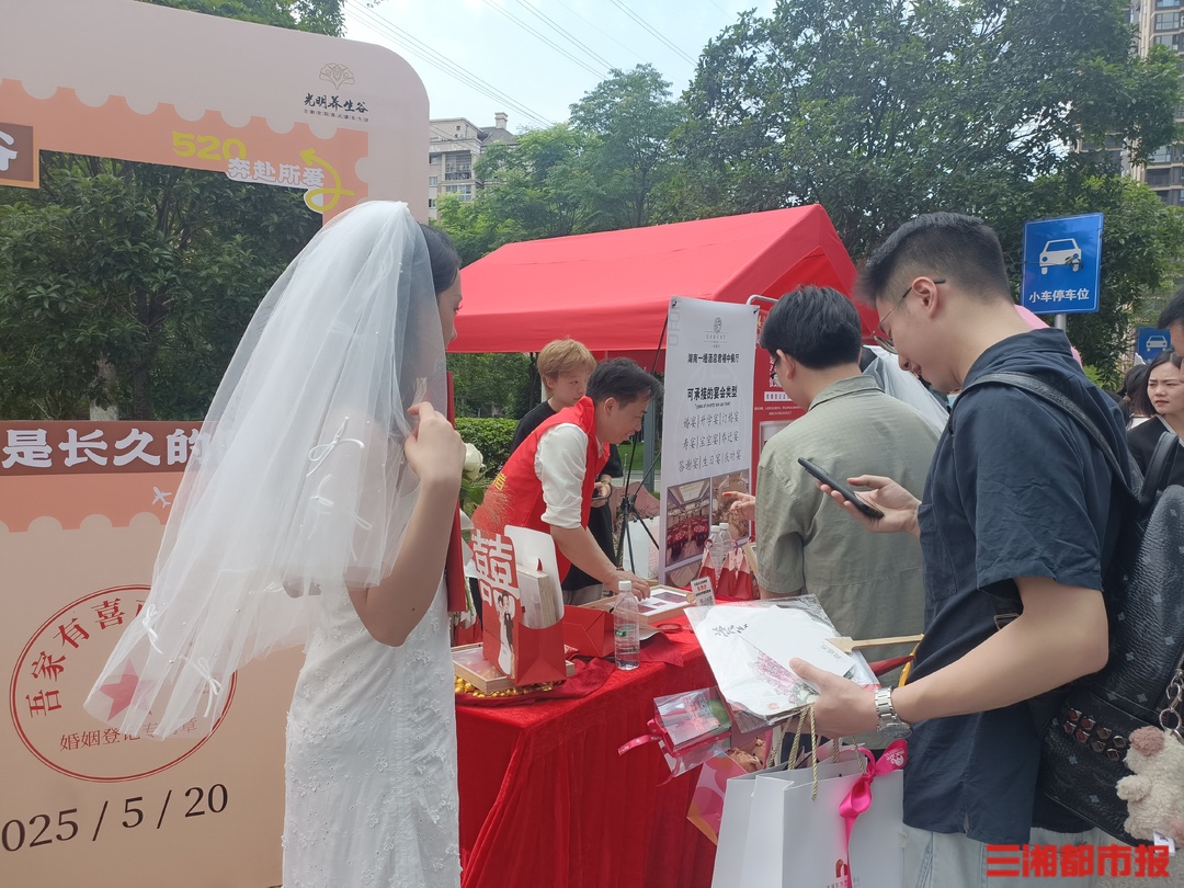 三湘都市报·新湖南客户端5月20日讯(文/视频 全媒体记者 杨昱 通讯员 龙羽茜)免费领头纱,扫码送玫瑰花,玩幸运转盘还能得小礼物……5月20日,湖南湘江新区民政和社会保障局婚姻登记中心,为新人们准备的惊喜不断。