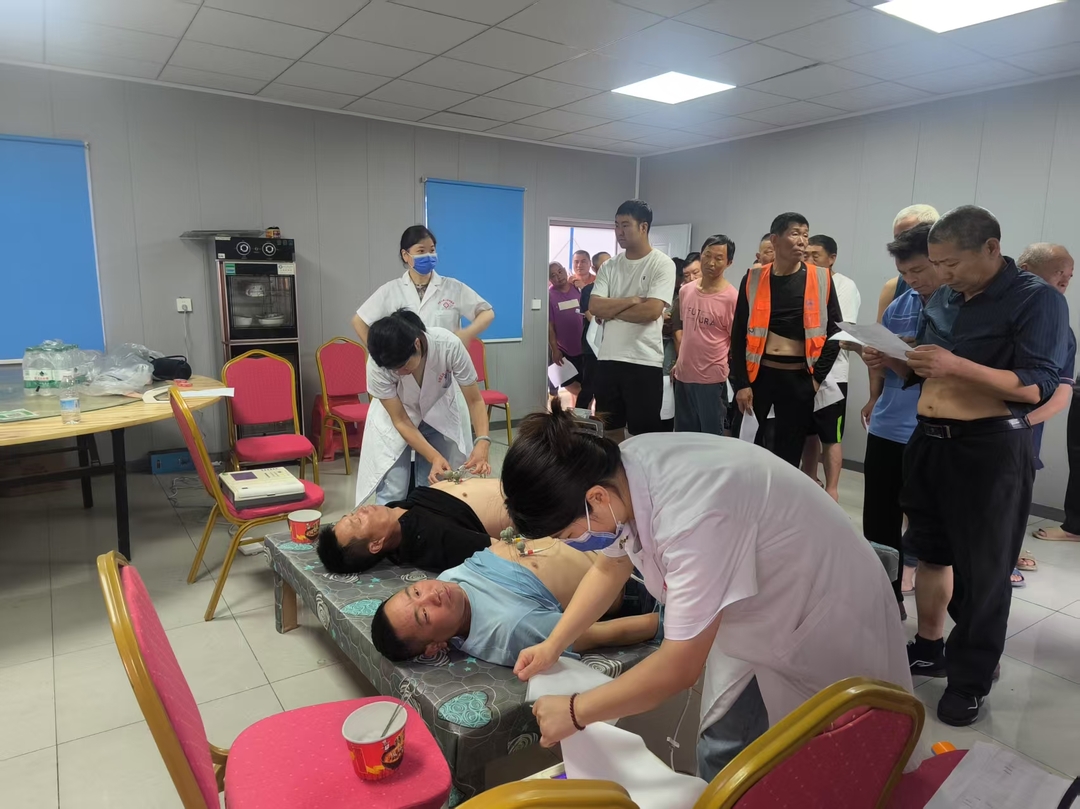 此次体检涵盖血常规、血压、心电图等多个检查项目,全方位覆盖建筑工人常见的职业病和健康隐患筛查。项目部根据各施工工序作业时间,制定了分批次体检计划,优化各项流程,加强医务人员配置,做好检查过程引导,减少劳务工等待时间,确保施工生产与体检两不误。在工作人员的引导下,劳务工有序地穿梭于各个体检区域,依次完成各项检查。现场还有设有专业医护人员对常见职业病防治、日常健康注意事项和中暑急救等问题进行耐心解答,帮助职工和劳务工提升健康意识。