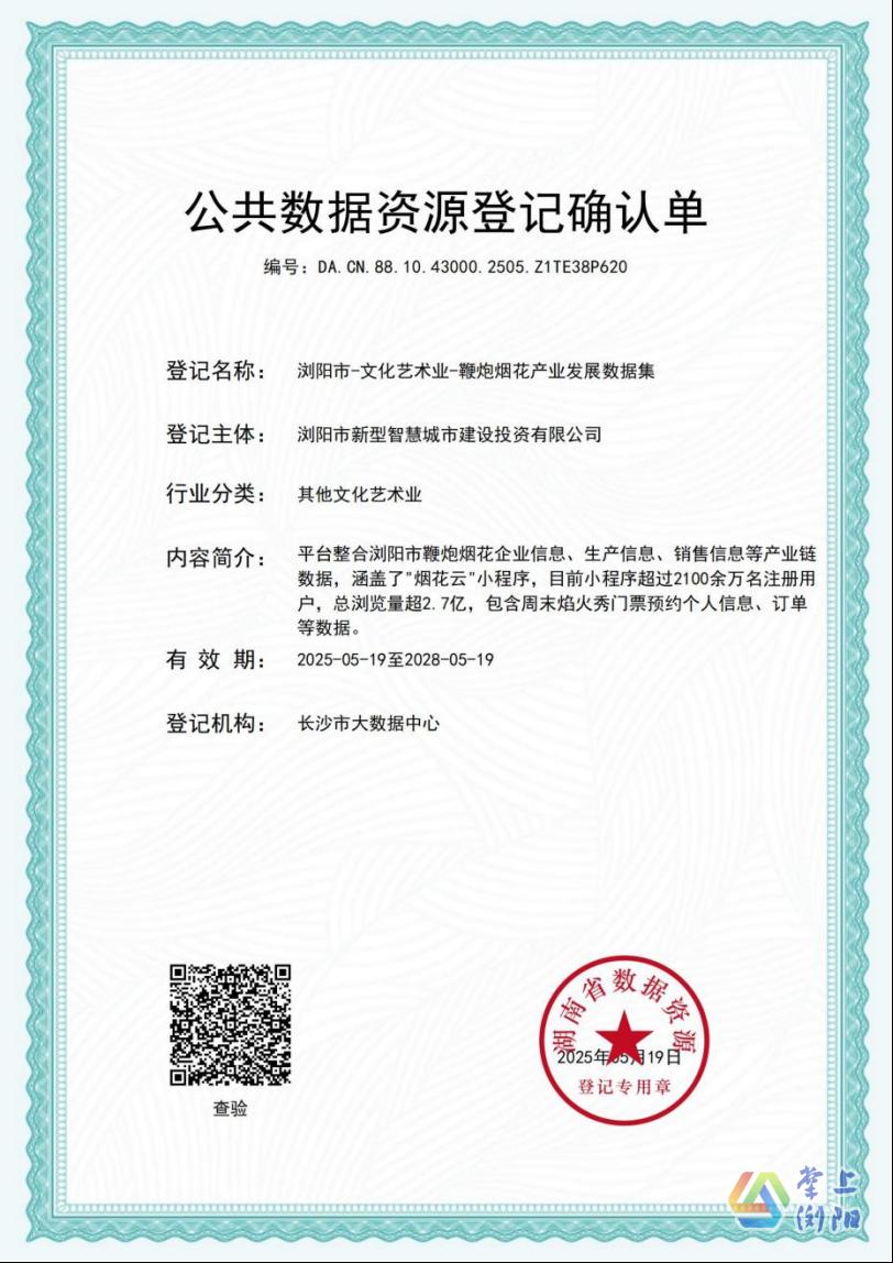 湖南日报·新湖南客户端5月20日讯(通讯员 张可夫 刘婷)公共数据资源作为国家基础性战略性资源,其开发利用对于推动数字经济发展具有重要作用。笔者今日从浏阳市数据和政务中心获悉,“鞭炮烟花产业发展数据集”于5月19日成功取得全省县域首张国家公共数据资源登记确认单,标志着浏阳市在推动县域数据要素市场化配置改革进程中迈出关键一步。