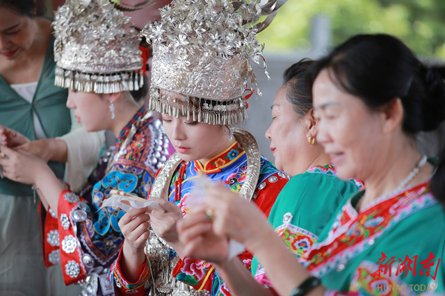 5月19日,一场别开生面的“百名绣娘绣生活”非遗技艺展示活动,在麻阳苗族自治县风雨桥上开展。身着苗族盛装的绣娘们飞针走线,湘绣的细腻雅致与苗绣的古朴质雅,从指尖逐步呈现,吸引众多市民、游客驻足欣赏。