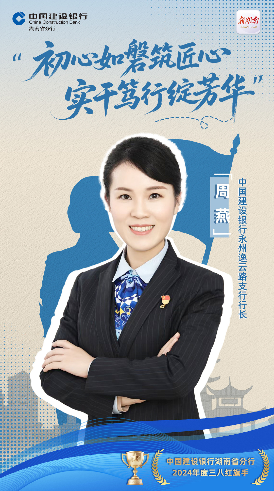 周燕,女,中共党员,2005年加入建行,现任中国建设银行永州逸云路支行行长。扎根金融一线二十载,她以严谨务实的工作作风和敢于创新的开拓精神,从一名综合柜员成长为独当一面的基层支行负责人。