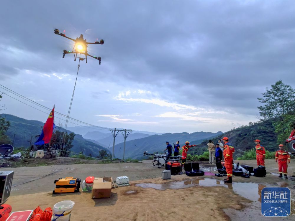 5月22日,消防救援人员在贵州省大方县果瓦乡庆阳村山体滑坡现场利用无人机运送救援物资(手机照片)。新华社记者 杨文斌 摄