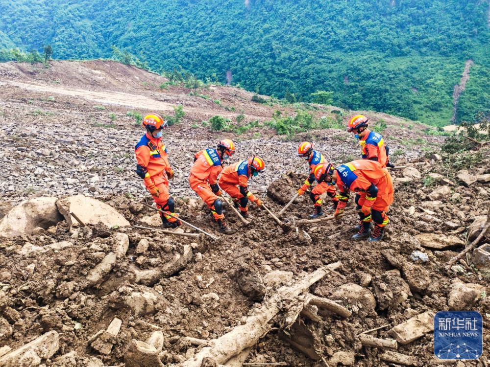 5月22日,消防救援人员在贵州省大方县果瓦乡庆阳村山体滑坡现场进行搜救。新华社发