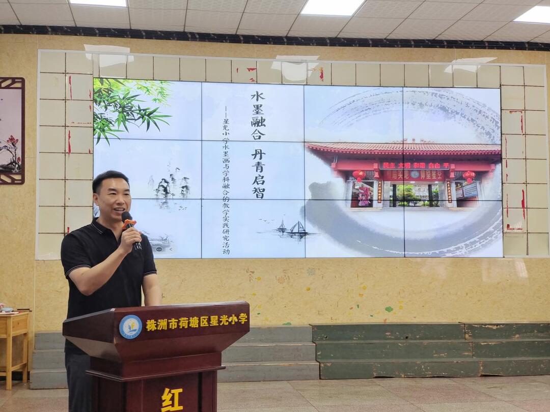 活动开始,星光小学校长吴世强介绍,学校在水墨校本课程研究上已经坚持了十六年,取得了丰硕的成功:《以“融合”之策助力“水墨星光”跨越发展》获湖南省中小学生艺术展演改革创新案例二等奖;《星光“水墨课程”——审美的提升与传统文化的传承》获株洲市中小学艺术展演美育改革创新优秀案例;《“千人水墨”课程的实践研究报告》获株洲市教研教改论文一等奖;情景剧《水墨情缘》获株洲市一等奖;《“千人水墨”课程的实践研究报告》获株洲市教研教改论文一等奖;学校获评“株洲市美术后备人才培养基地”等。将其与学科教学相融合,是一次全新的尝试,也是水墨校本课程研究的重要里程碑,学校将继续深化研究,推动水墨画与学科融合教学向更高水平发展。
