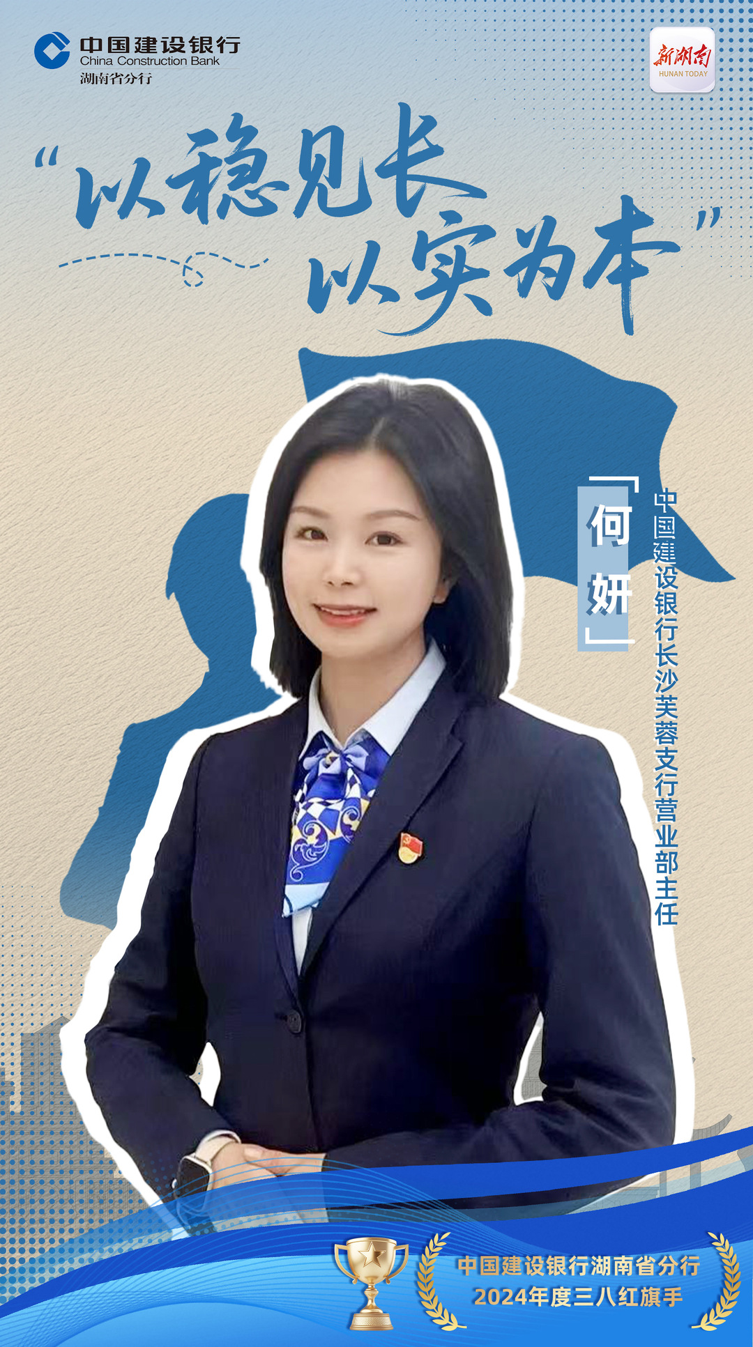 何妍,女,中共党员,中国建设银行长沙芙蓉支行营业部主任。她2012年入行,以高度的责任心和专业精神,带领团队深耕服务、精耕管理,在细微处见温度,于攻坚中见担当,曾获总行渠道运营先进个人,荣膺省行第八届十大杰出青年,连续两年获评支行优秀党务工作者。