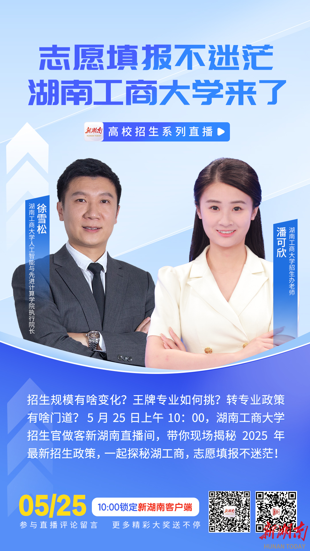 5月25日(本周日)上午10点,湖南工商大学招生官做客新湖南直播间,带你现场揭秘2025年最新招生政策,一起探秘湖工商,志愿填报不迷茫!