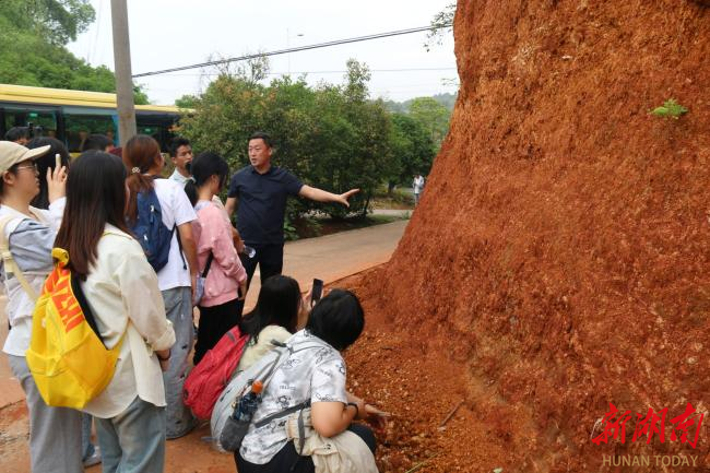 随后,实习队伍来到长沙县义兴农业有限公司,观察不同地质年代发育的自然剖面并分析其土壤成因。指导老师介绍了不同地质时期母岩母质和土壤的形成过程及在特定地理位置的分布情况。同学们仔细观察剖面的颜色、质地、结构等特征,结合讲解,努力探寻地形地貌与土壤形成的内在联系。